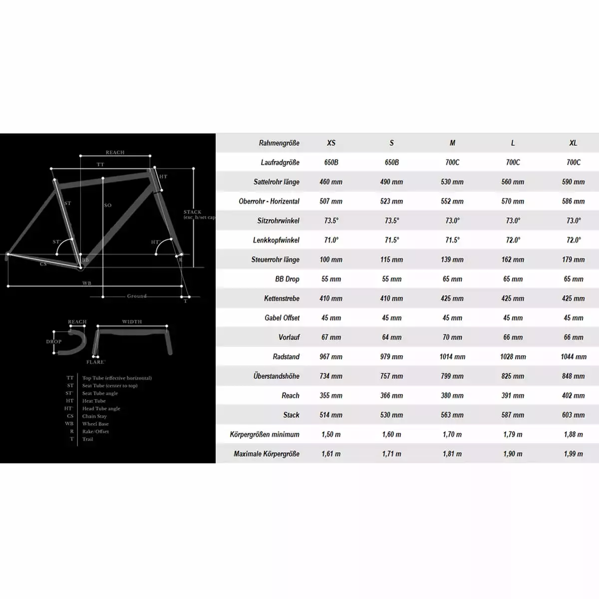 max. Reifenbreite (v/h): 650 B x 37C / 650B x 35C, M – XL: 700C x 37C (XS/S)