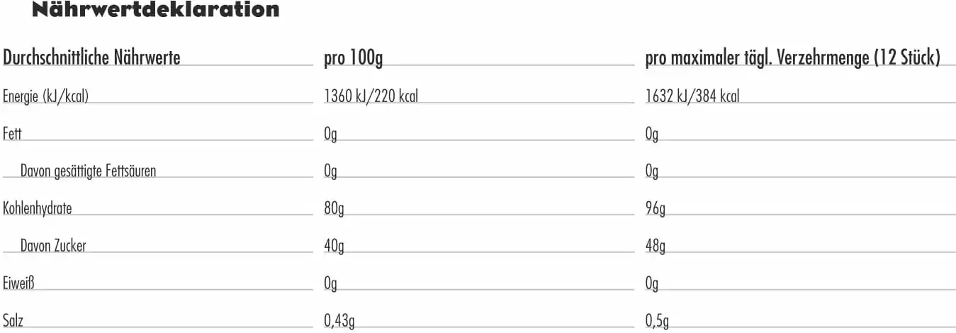 - Brennwert: 1360 kJ / 320 kcal