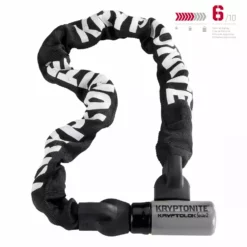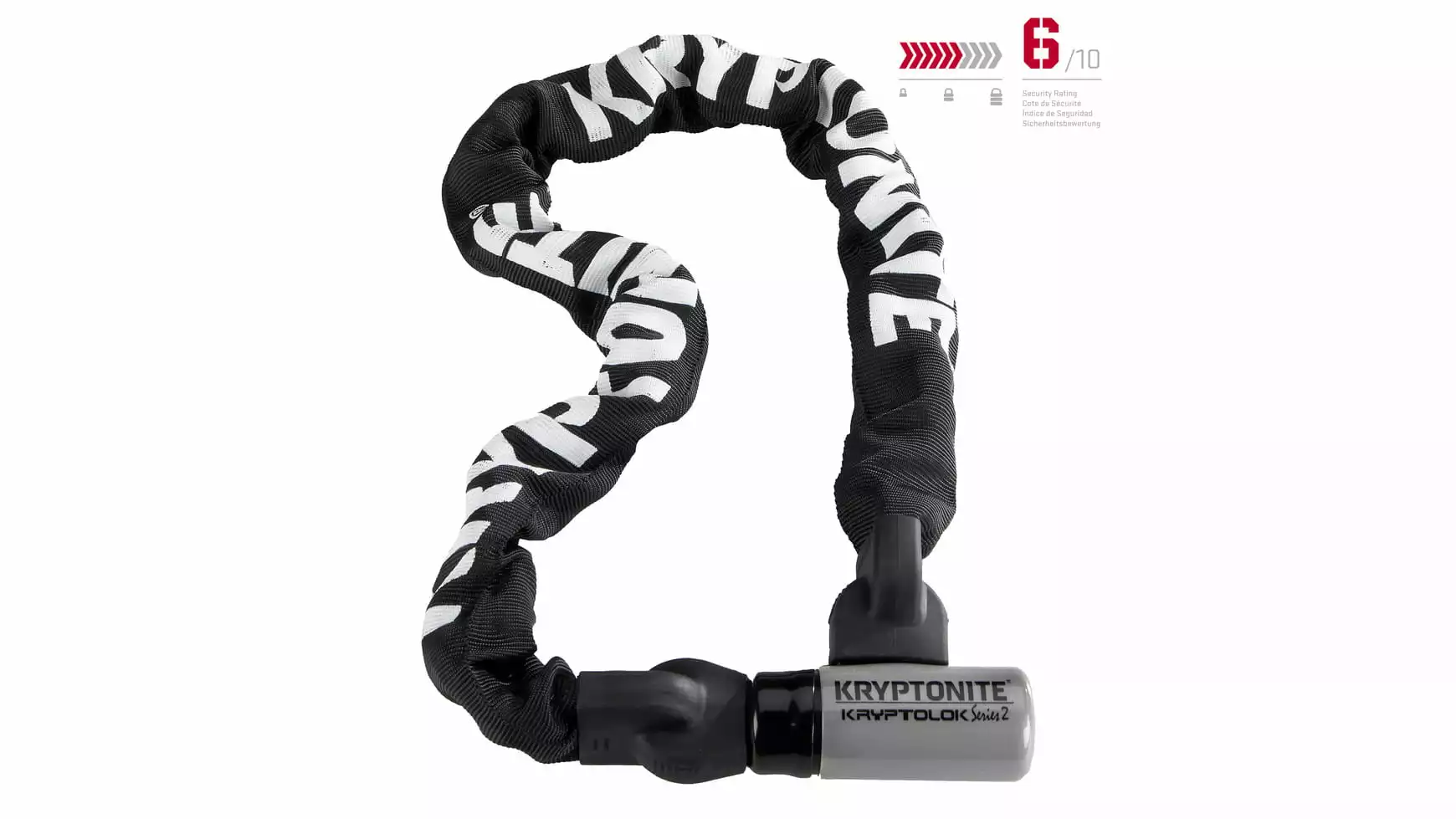 Die Verschlusstechnik ist ein neues Patent von Kryptonite: das letzte Kettengleid dient gleichzeitig als Verschlusskopf, was einen Schwachpunkt am Schloss ausschließt.